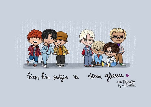 Run BTS Episode 30 chibi art print, archive quality, kpop illustration, bangtan character art, Team Glasses print, Team Kim Seokjin wall art