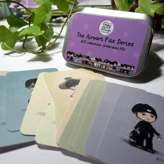 BTS Airport Fits gift tin - illustrated bangtan chibi photocards - perfect ARMY gift