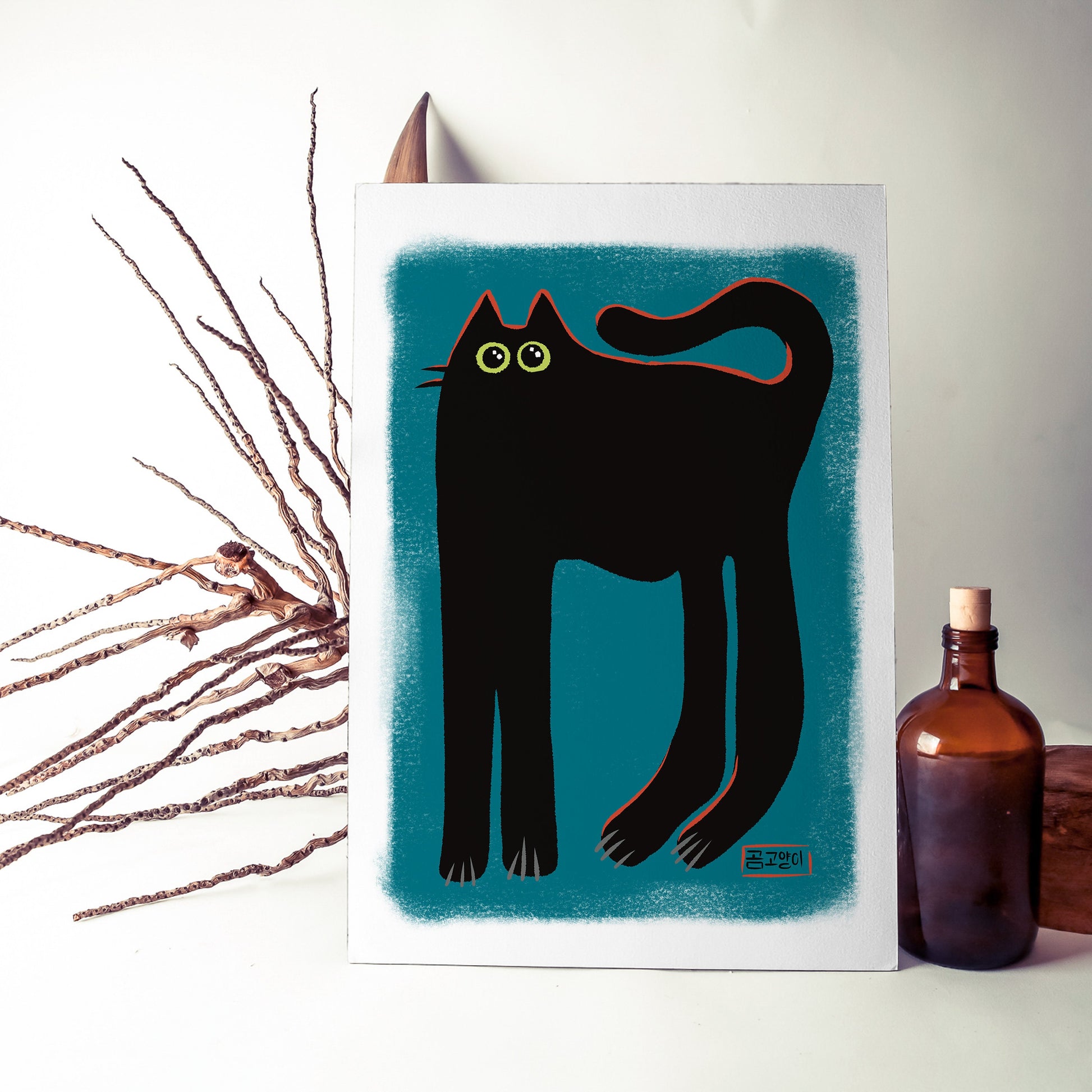 In bold strokes and colours with a distinctly modernist Korean influence, this awesome black kitty art print can be glaring at you from your very own wall supersoon.