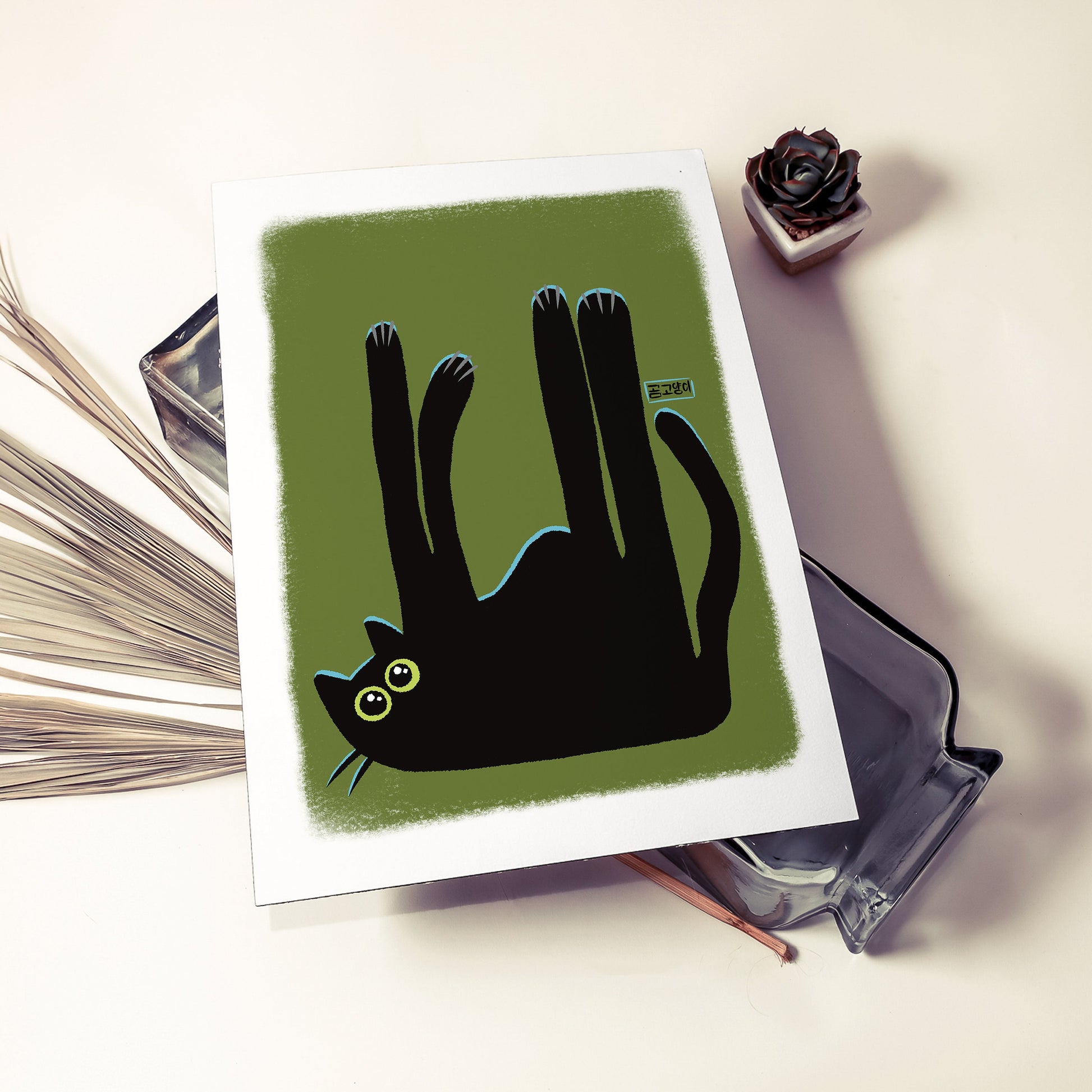 In bold strokes and colours with a distinctly modernist Korean influence, this awesome black kitty art print can be glaring at you from your very own wall supersoon.