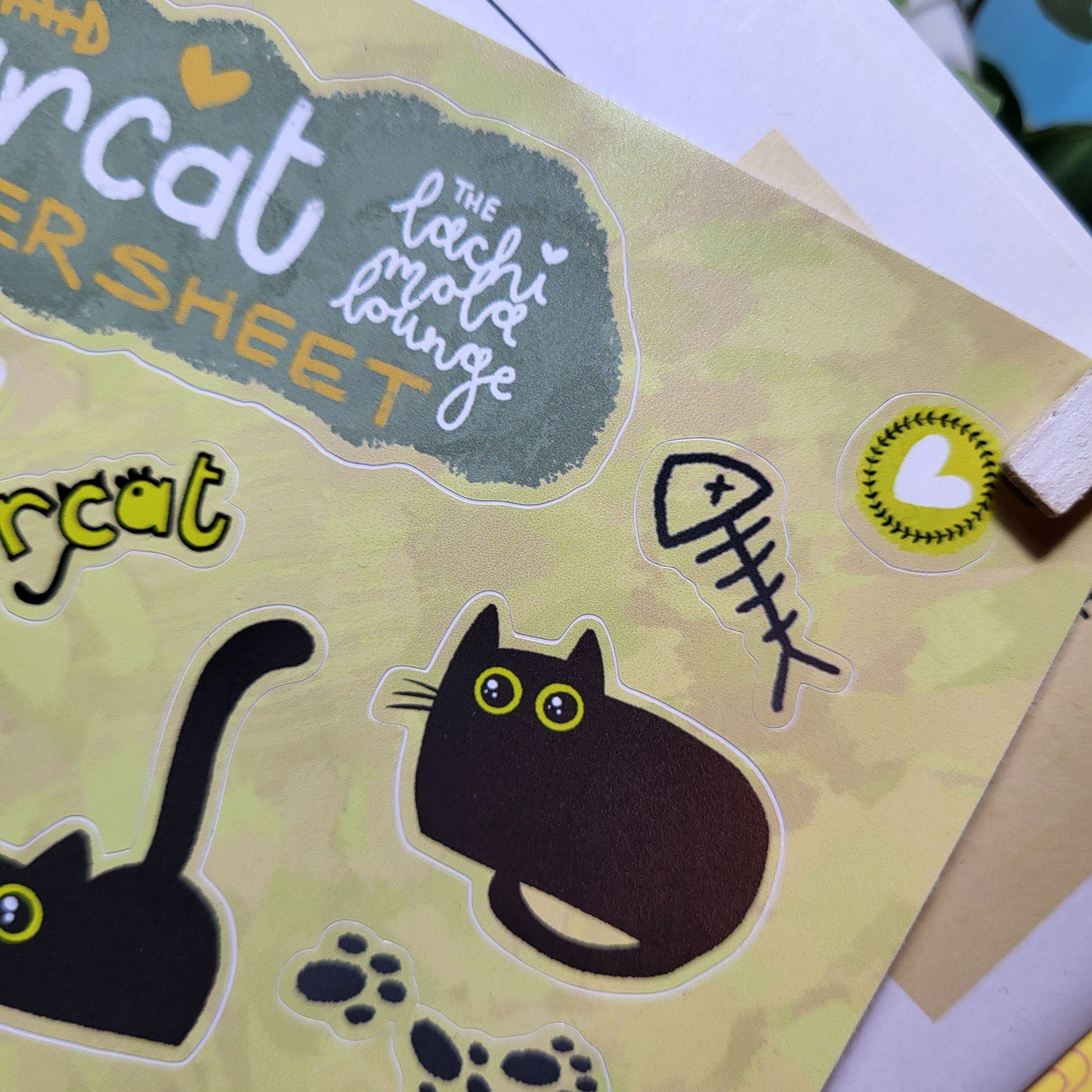 A5 (148x210mm) matt vinyl kiss-cut sticker sheet, featuring my voidy feline in most of his favourite poses.