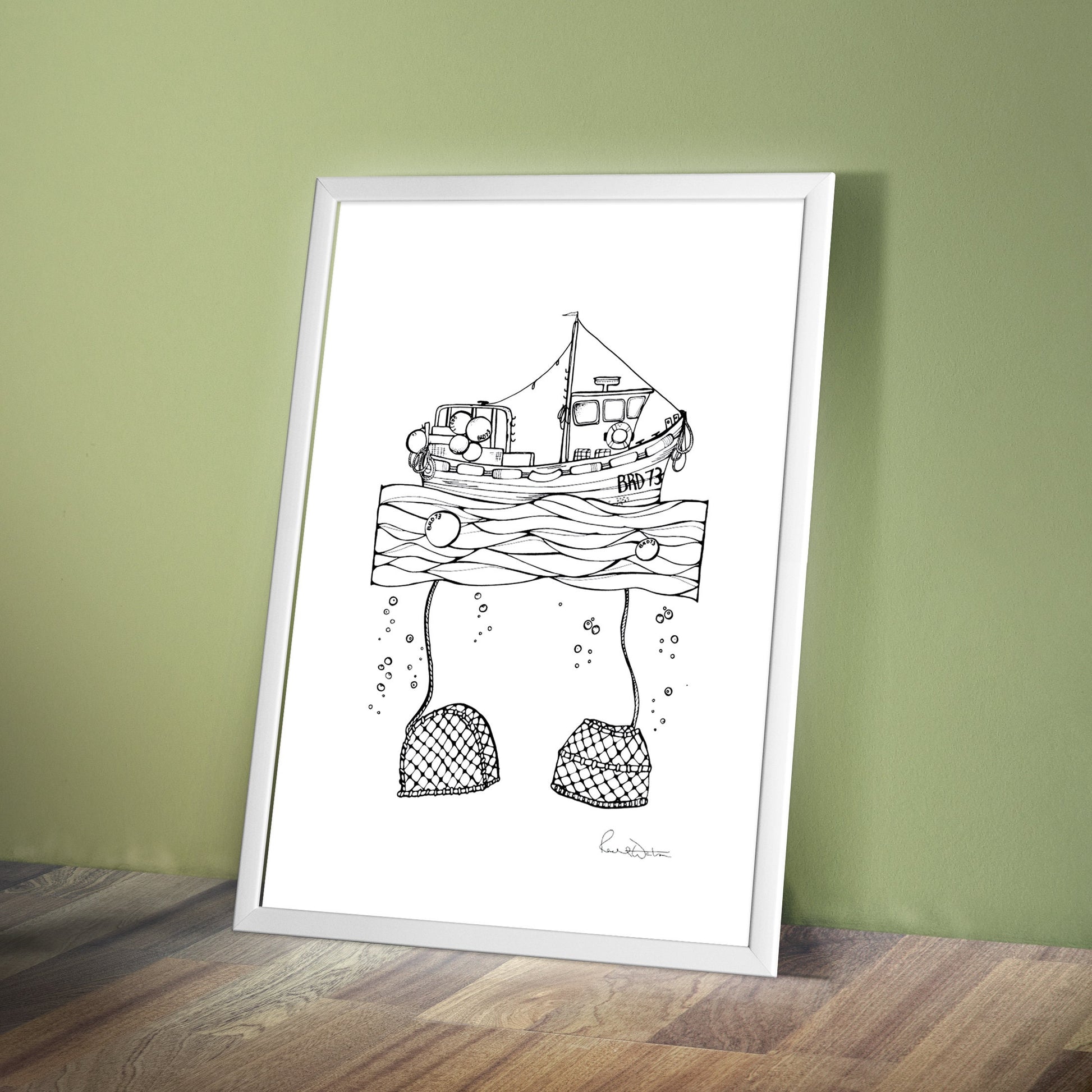 Featuring a fishing boat spotted in Broadford harbour on the Isle of Skye, this drawing is printed with archival quality inks and paper, ready to pop into your favourite frame. Monochrome so that it fits in with any decor in any room, maybe it reminds you of a trip, or inspires you to take a future one.