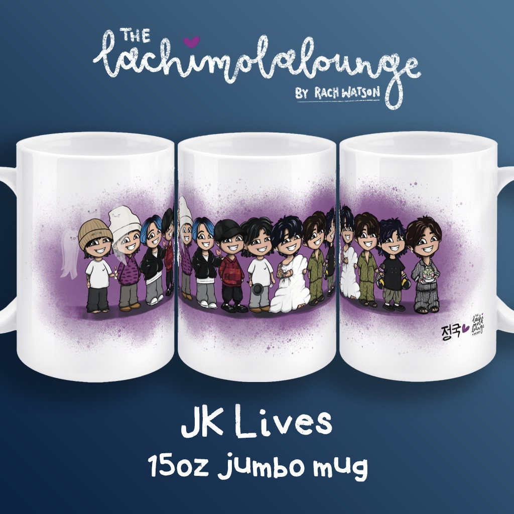 A jumbo 15oz mug featuring a cute AF lineup of JKs from his Weverse and V Lives.
