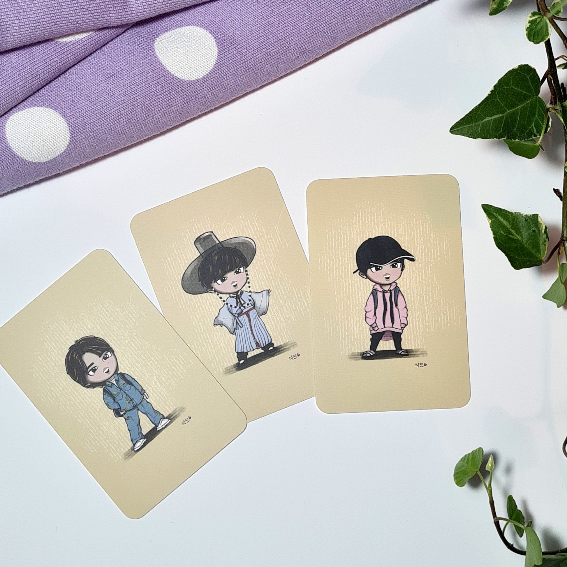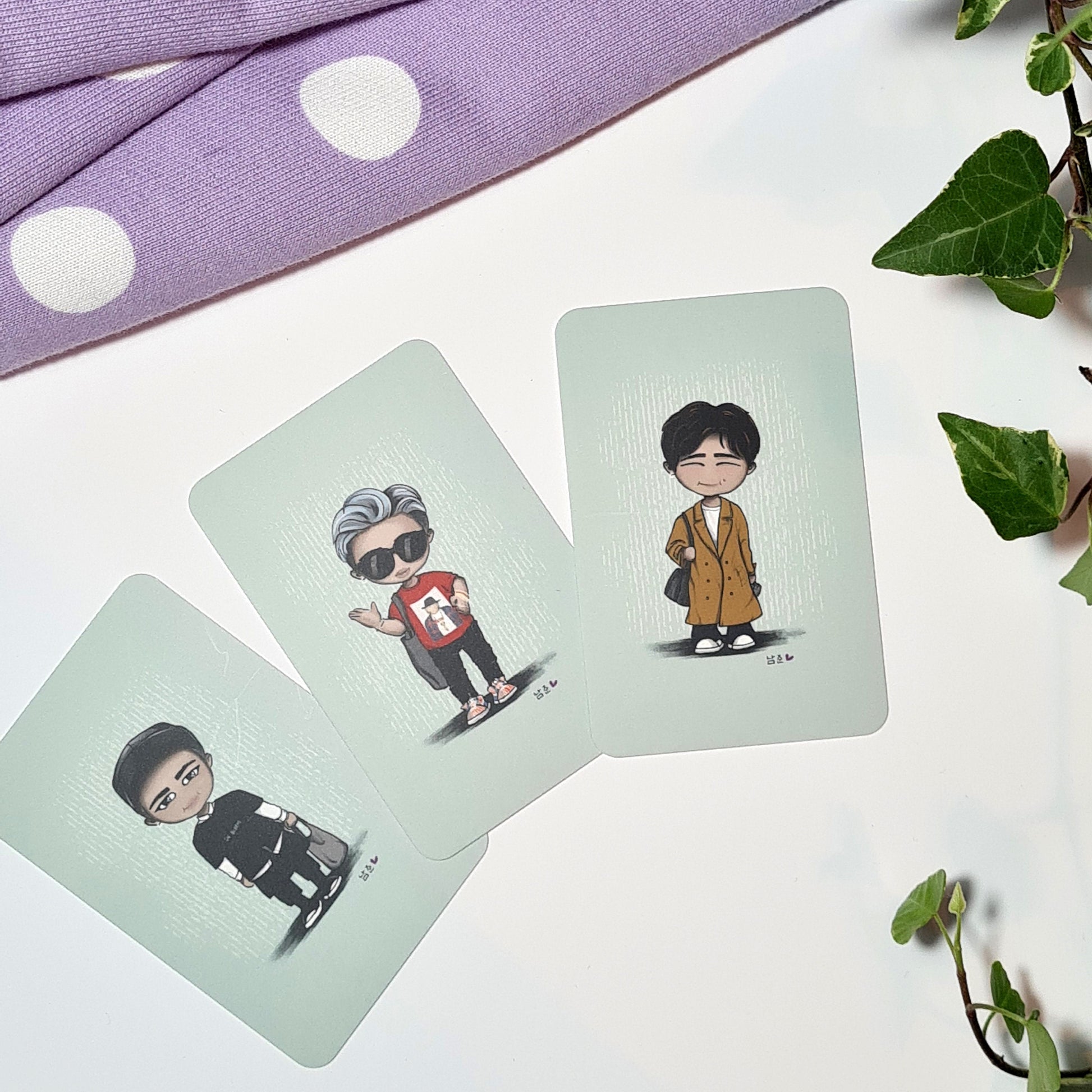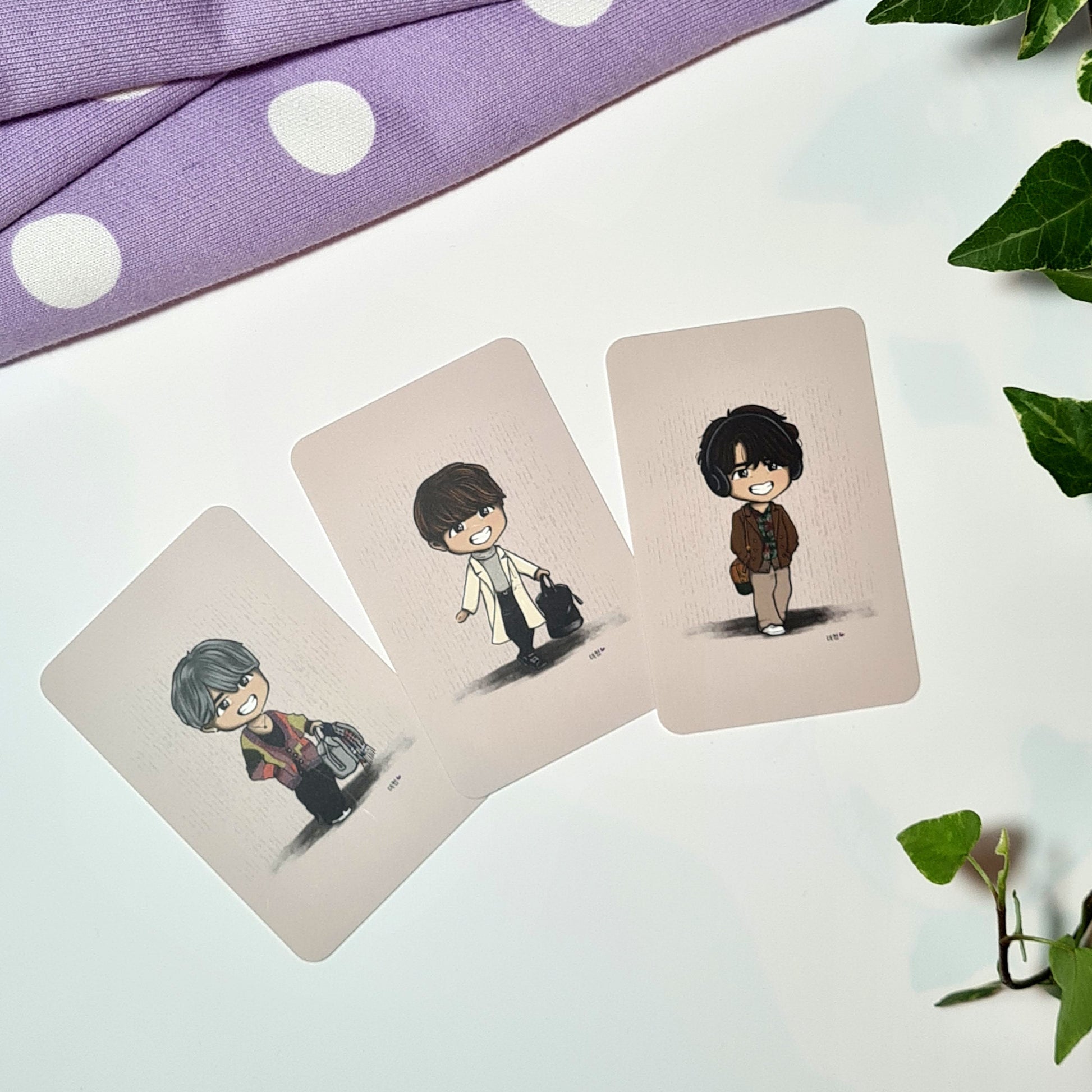 Deliciously cute lil photocards featuring my illustrations of some of our boys' legendary airport farshun...each bangtannie has three of their fits featured - and lemme tell you, picking just three out of all of them was NOT easy. I may have had to do a LOT of research. Still am, tbh.