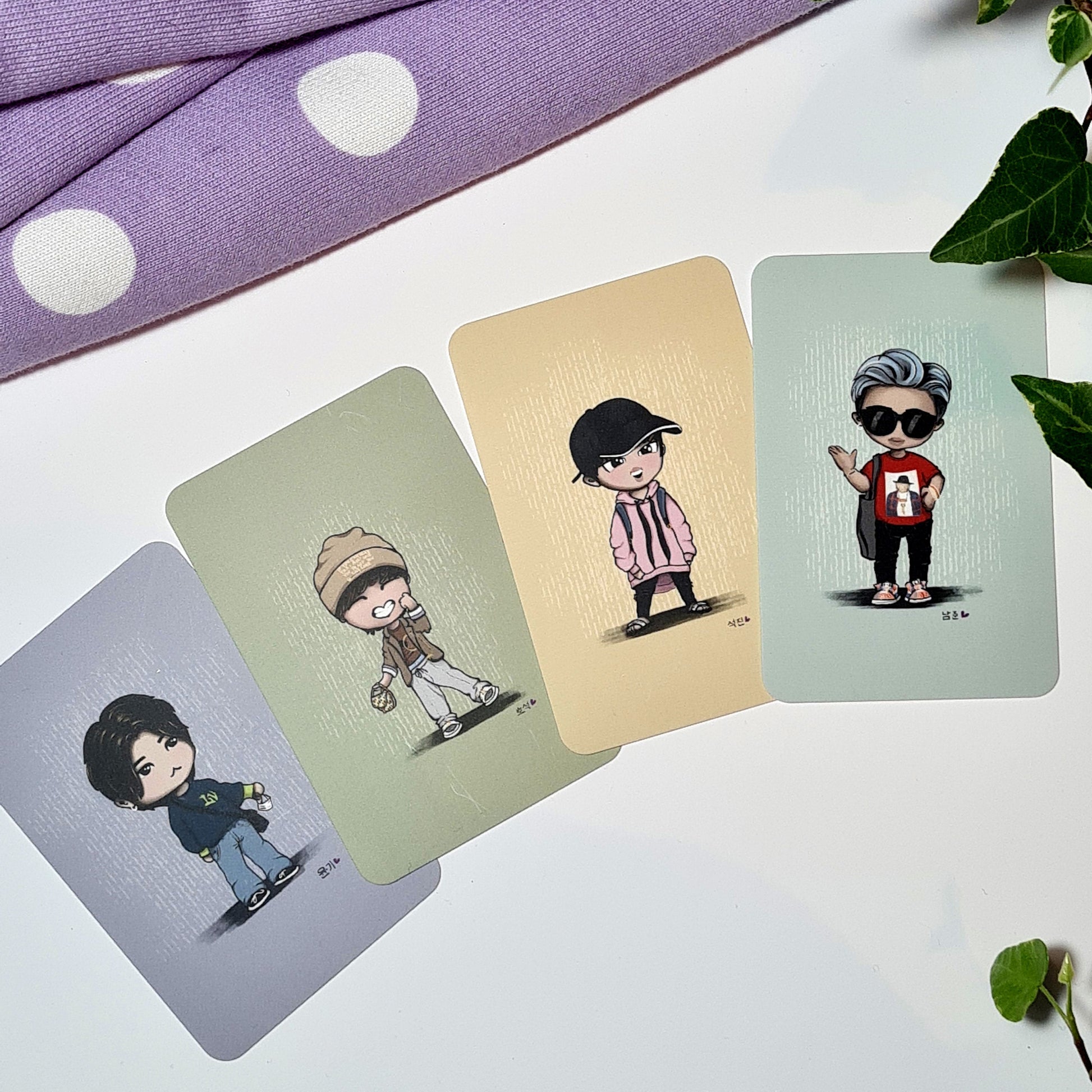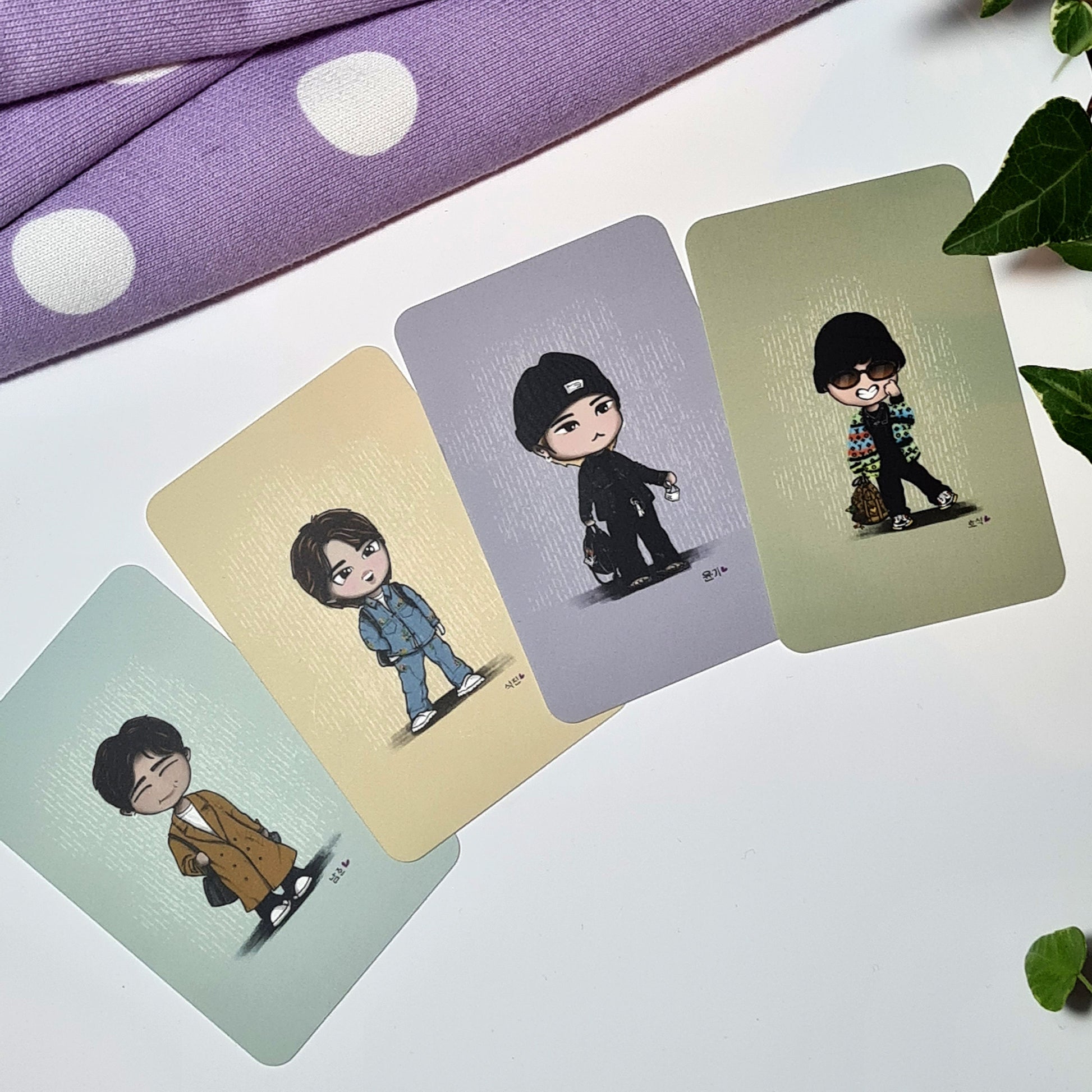 Deliciously cute lil photocards featuring my illustrations of some of our boys' legendary airport farshun...each bangtannie has three of their fits featured - and lemme tell you, picking just three out of all of them was NOT easy. I may have had to do a LOT of research. Still am, tbh.