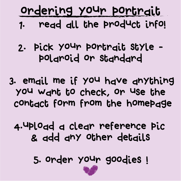 - Add any specific details you'd like me to make sure I capture - like eye colour, specific jewellery, accessories or a lil pet etc. - and if you're ordering a polaroid style print, add any text you want at the bottom into this box too