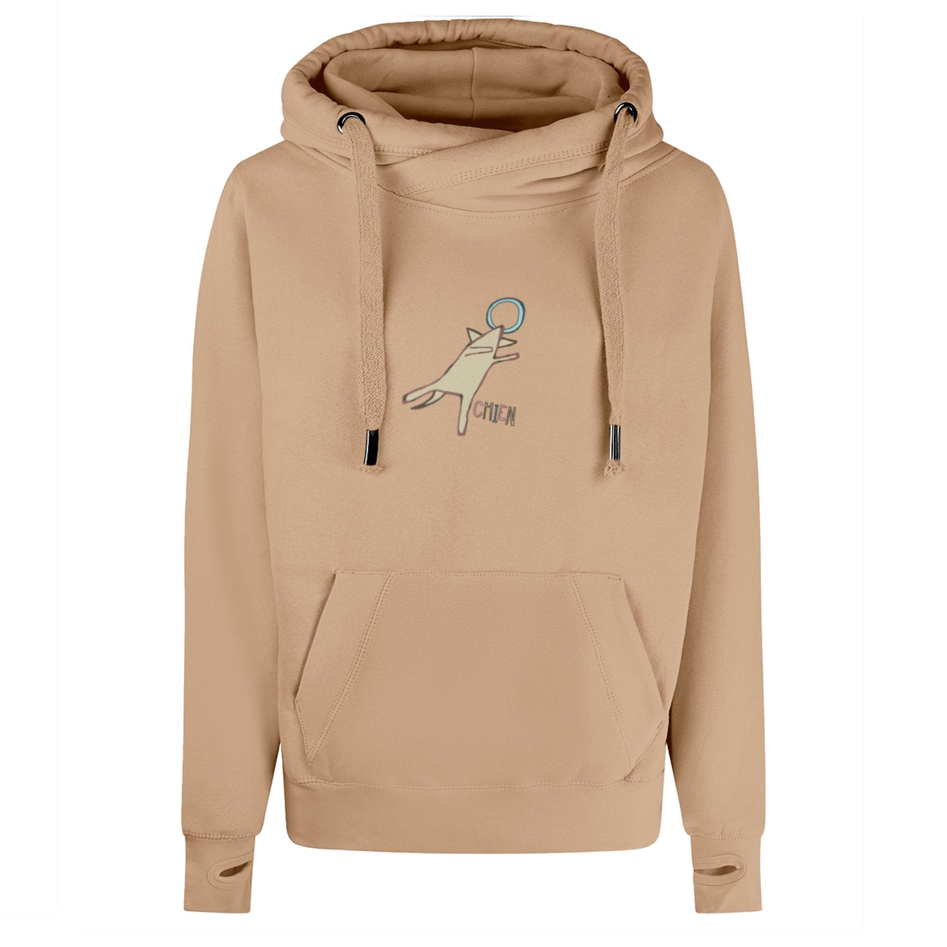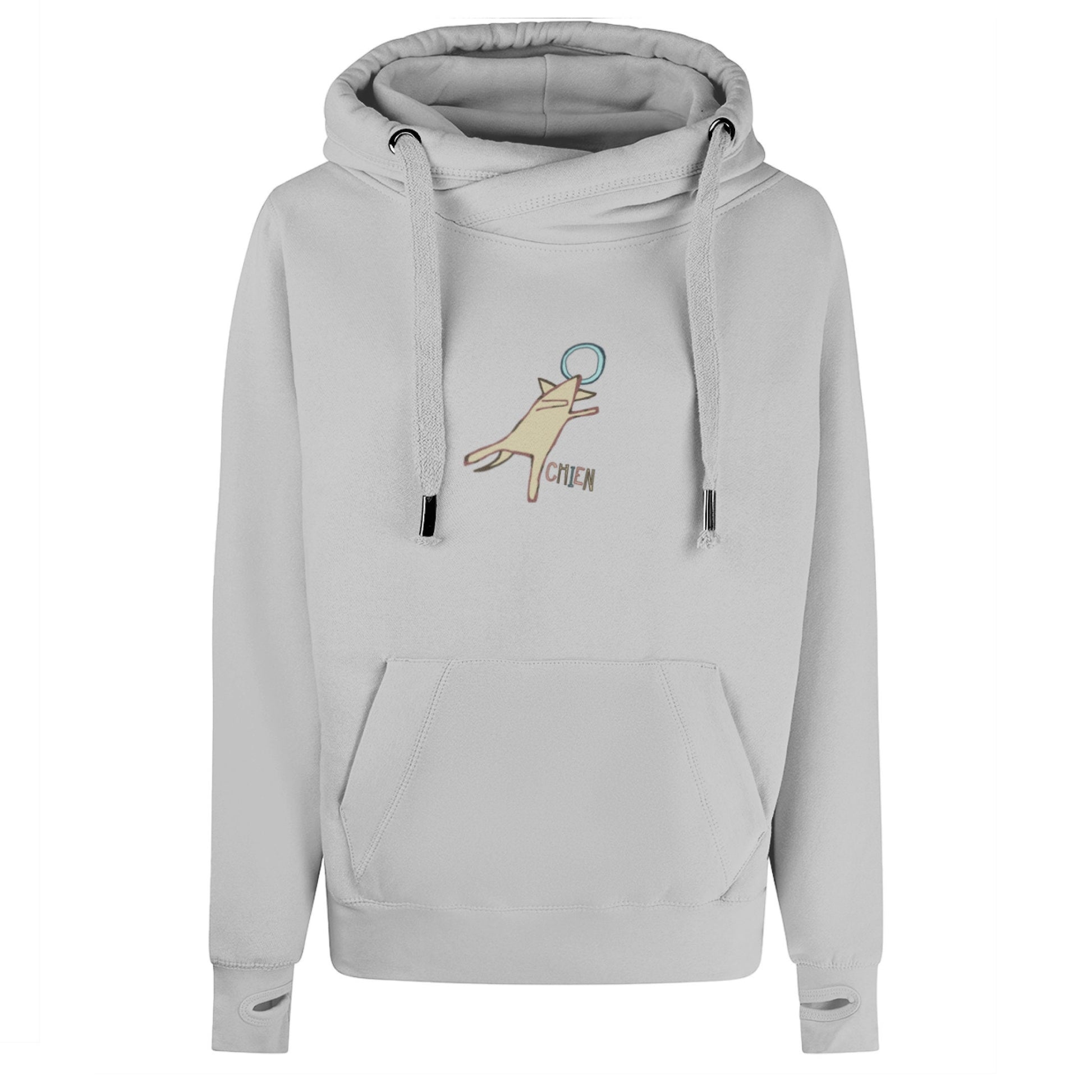 This hoodie. MY GOD this hoodie. It's gorgeous. Wide cross cowl neck, thumbholes for those snuggly sweater paws, chonky drawstrings, and my frisbee doggo design on the front. Lookit him go!! You couldn't possibly want for anything cosier.