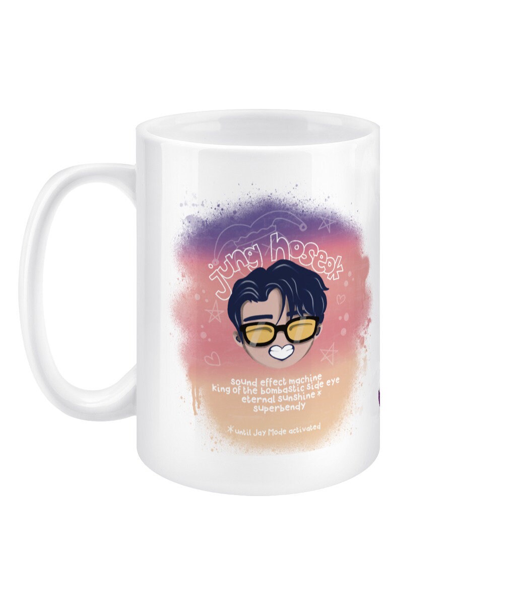 Hobi's heart shaped sunshine smile to brighten your day, complete with a rundown of his most important characteristics. I mean, this mug could have been twelvety feet tall if I listed all his awesome things, so sue me if I condensed it a bit.