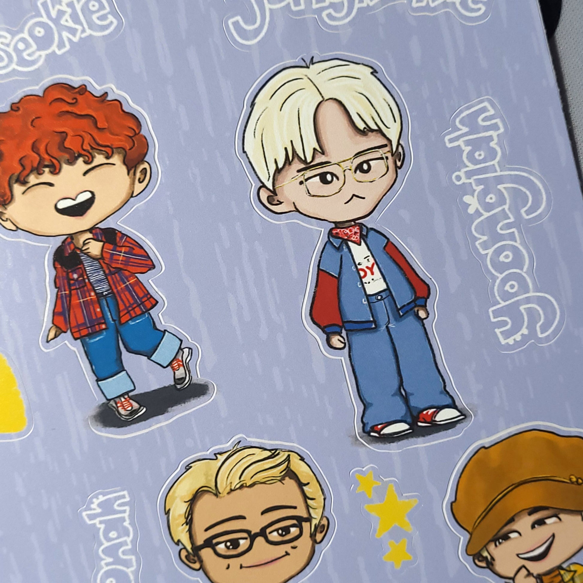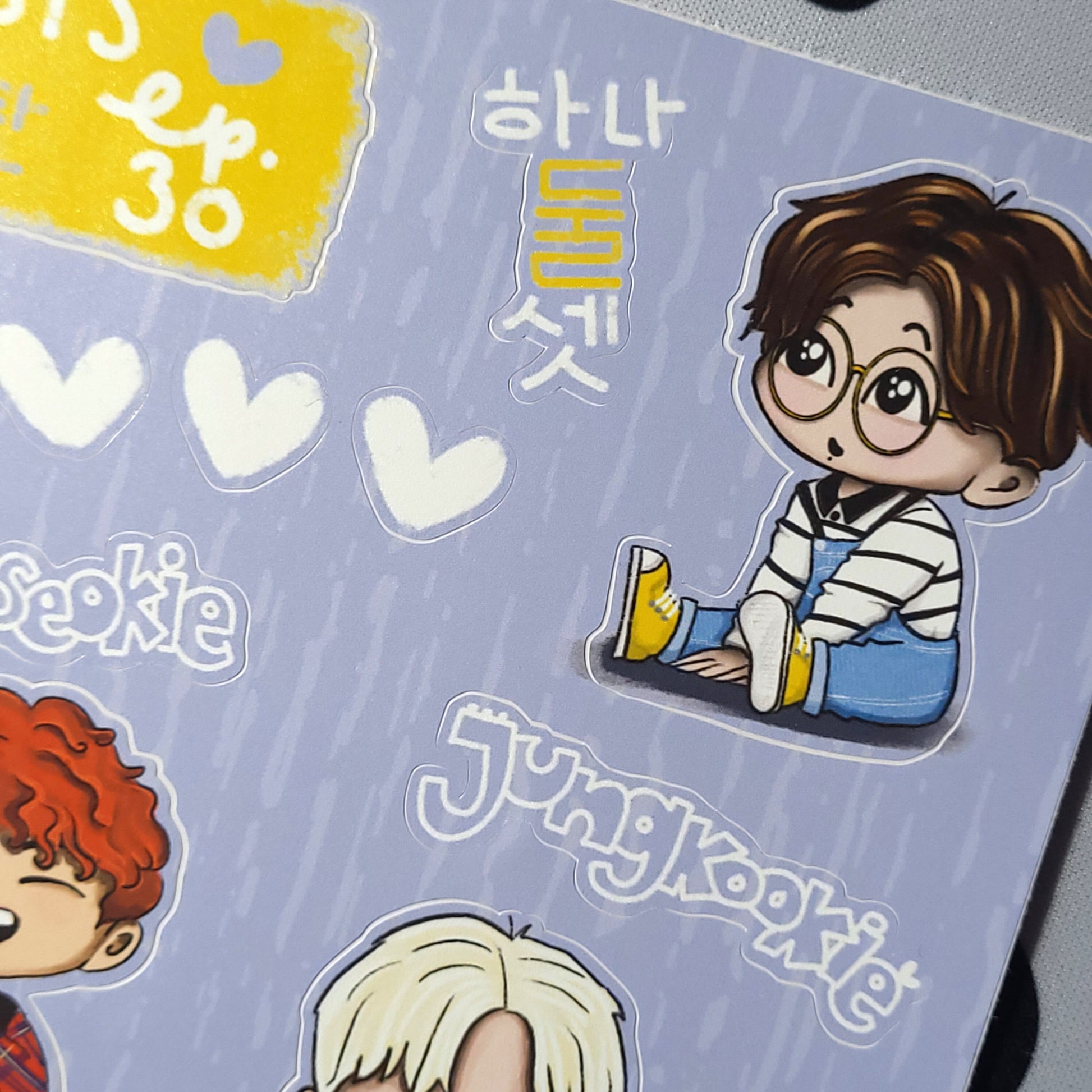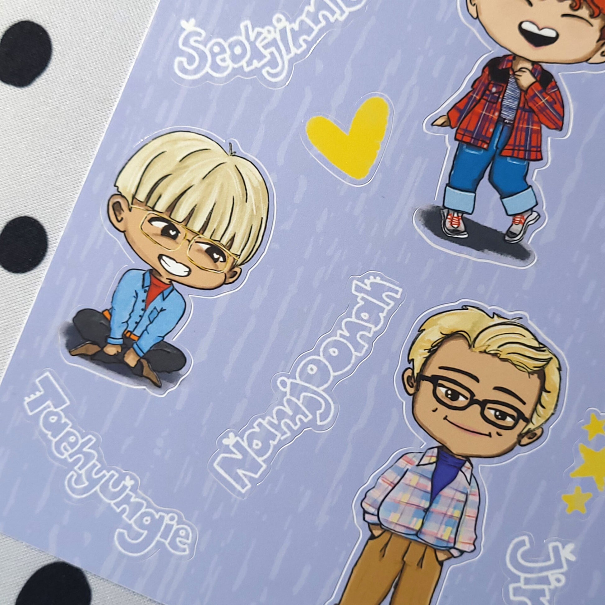 Supercute matte vinyl sticker sheet depicting the sartorial EXCELLENCE that is Run BTS Episodes 30/31, featuring my exclusive chibi illustrations of these fashion icons.