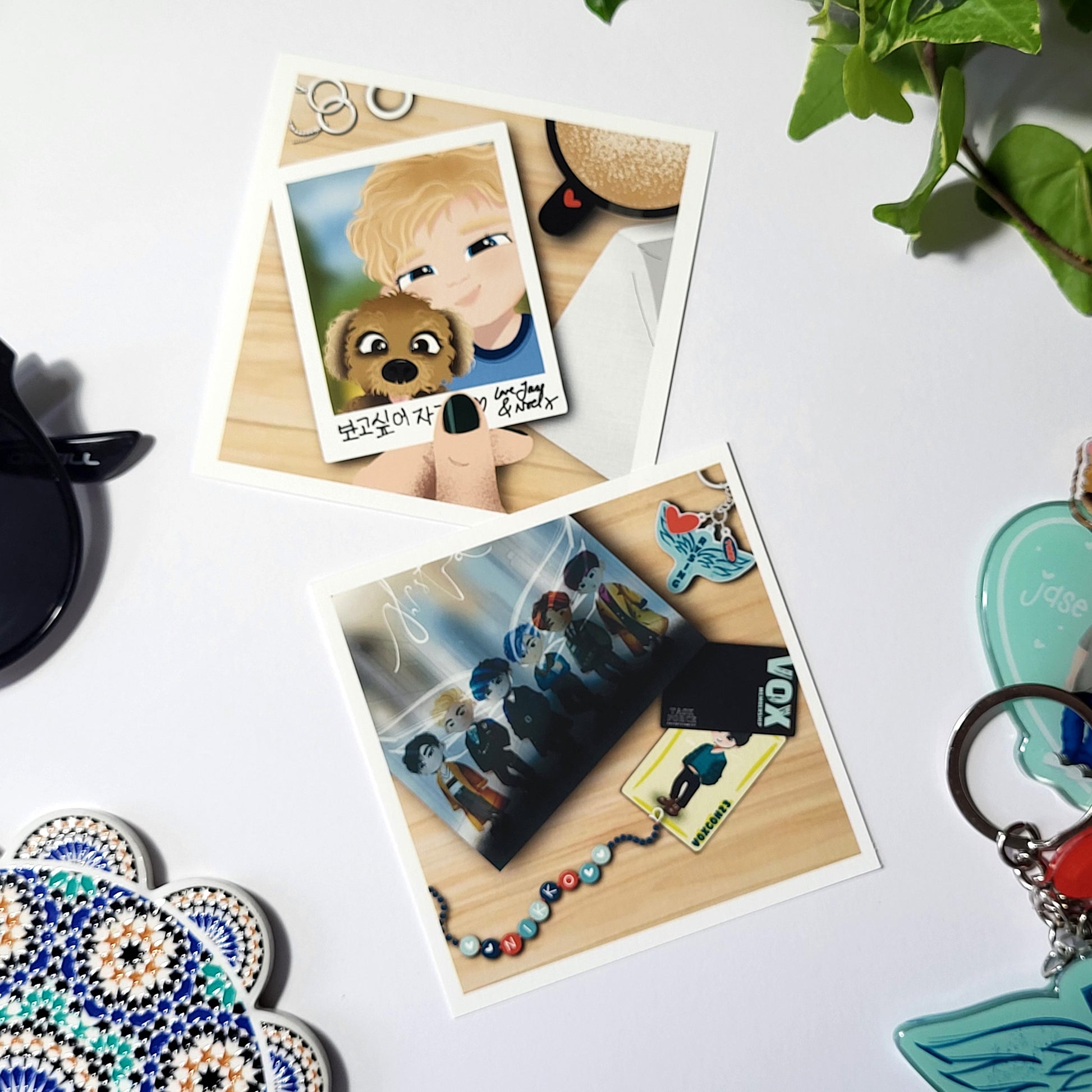 Some mini-prints featuring context moments from the world of RYSING and Jase & Nikko. Every VOX's must-have accessories - friendship bracelets, keychains, albums, membership and photocards...and Nikko's Polaroid snail mail arriving with his morning coffee all the way from the States.